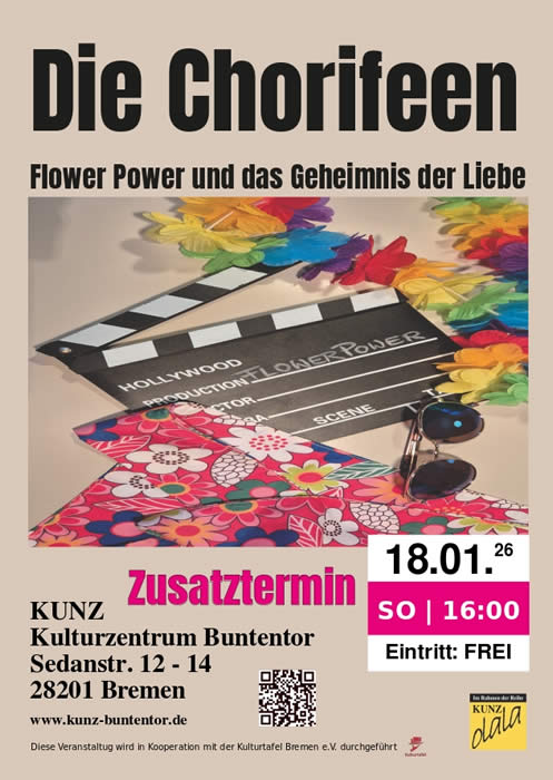 Die Chorifeen präsentieren ihr neues Kurzprogramm "Flower Power und das Geheimnis der Liebe" nochmal am Sonntag, 18.01.26 um 16 Uhr im KUNZ (Sedanstr.12, 28201 Bremen) und am Freitag, 27.02.26 um 18 Uhr im Alten Fundamt/Bio Biss (Auf den Kuhlen 1A, 28203 Bremen)