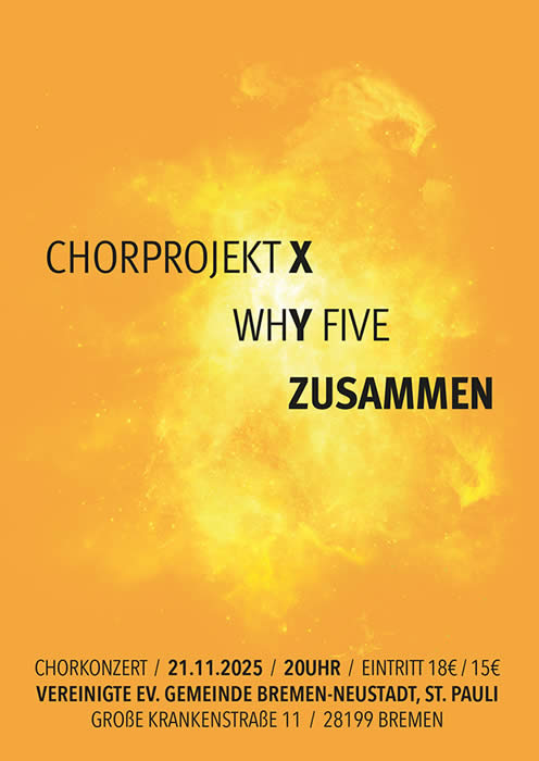 Einladung zum Doppelkonzert: Chorprojekt X und Whyfive am Freitag, 21.11. 25 um 20 Uhr – Vereinigte Ev. Gemeinde Bremen-Neustadt, Kirche St. Pauli